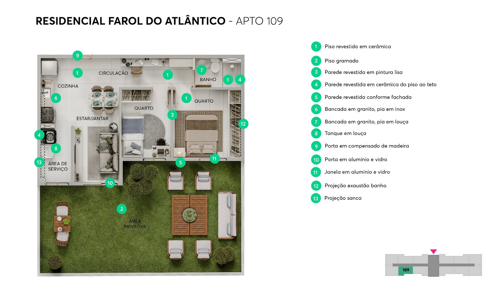 Planta farol do Atlântico apartamentos térreo: 103, 104, 105, 106, 107, 108, 109, 110. As imagens são meramente ilustrativas, buscando representar artisticamente o empreendimento. Móveis, objetos, revestimentos decorativos, equipamentos e demais acabamentos são apenas referências e não fazem parte do contrato de compra e venda da unidade. Consulte o memorial descritivo para obter detalhes sobre as características e materiais a serem entregues no empreendimento. Consulte mais informações no final do material. Material destinado exclusivamente à divulgação do produto. As vendas serão realizadas somente após a obtenção do Registro de Incorporação.