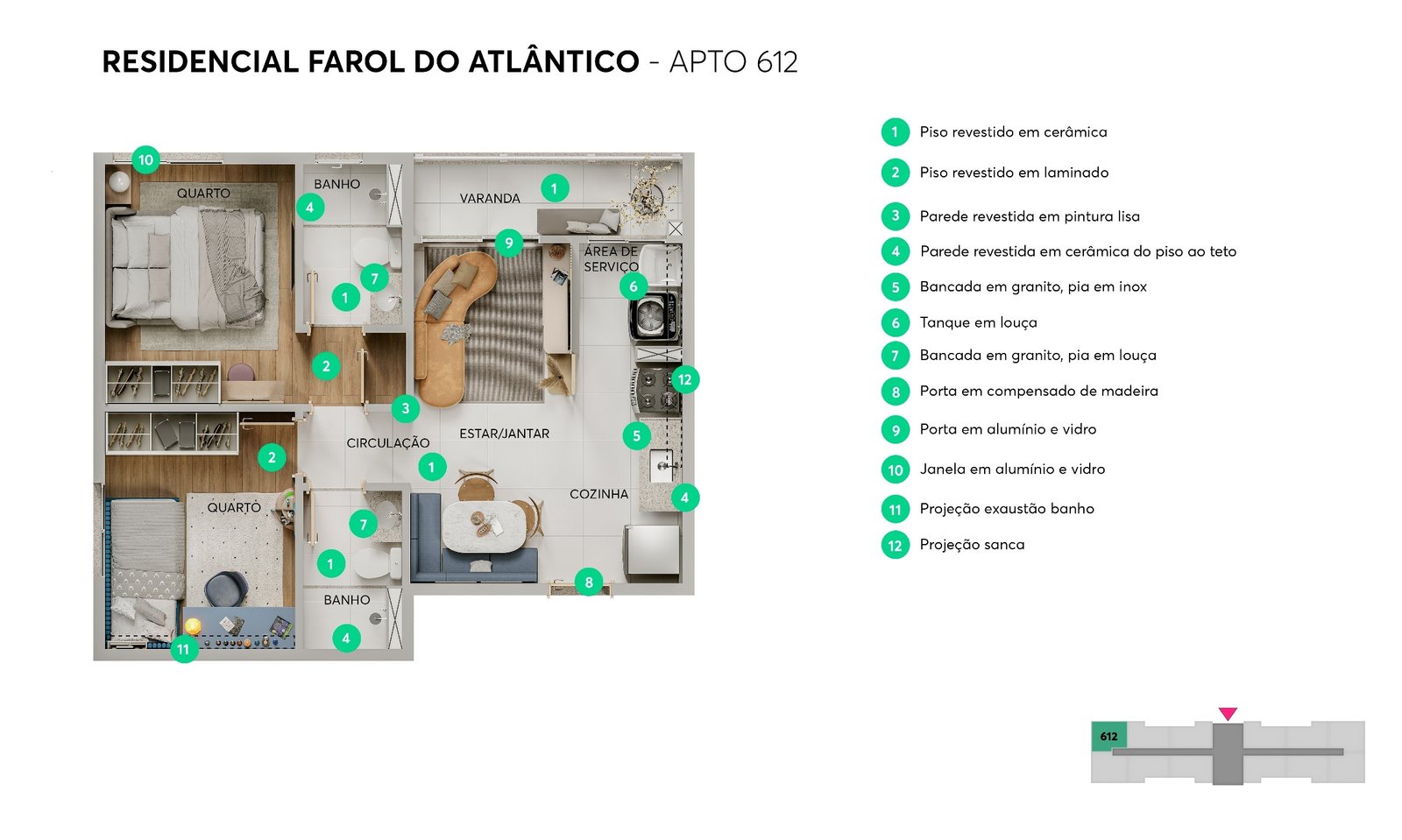 Planta farol do Atlântico apartamentos: números finais 02, 11. Planta dos apartamentos números finais 01 e 12 tem a posição dos ambientes invertida. As imagens são meramente ilustrativas, buscando representar artisticamente o empreendimento. Móveis, objetos, revestimentos decorativos, equipamentos e demais acabamentos são apenas referências e não fazem parte do contrato de compra e venda da unidade. Consulte o memorial descritivo para obter detalhes sobre as características e materiais a serem entregues no empreendimento. Consulte mais informações no final do material. Material destinado exclusivamente à divulgação do produto. As vendas serão realizadas somente após a obtenção do Registro de Incorporação.